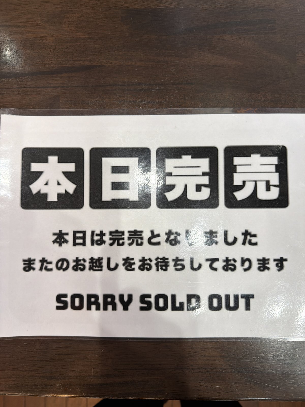 昨日に引き続き、本日も完売致しました。 2025年12月21日 17:22 その他 12月21日(日曜日)雨にもかかわらず沢山のお客様にご来店頂き、仕込み分全てが完売となりました。昨日に引き続き、足元がお悪いにも関わらず、沢山のお客様にご来店頂き、感謝しております。 Tweet